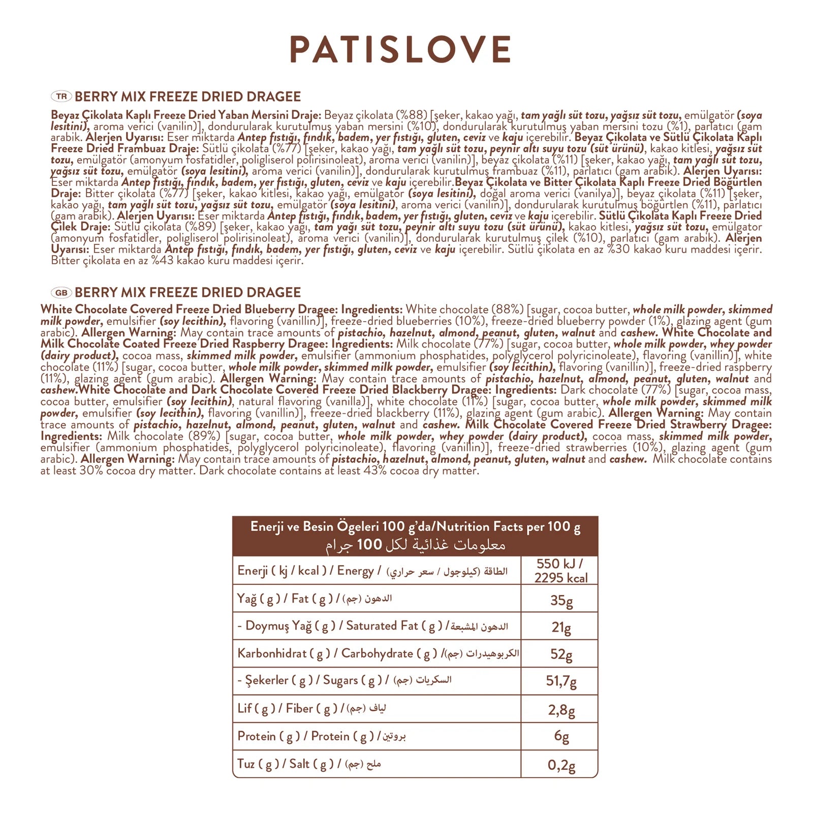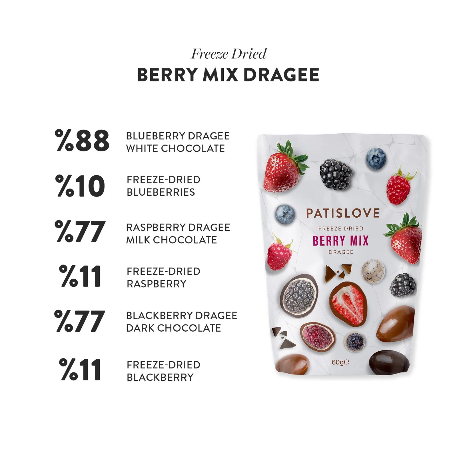 Erlebe den farbenfrohen Genuss von PatisLove Berry Mix Dragees – einer edlen Mischung aus gefriertrockneten Erdbeeren, Heidelbeeren, Himbeeren und Brombeeren, umhuellt von cremiger Milchschokolade, edler Zartbitterschokolade und feiner weisser Schokolade.
