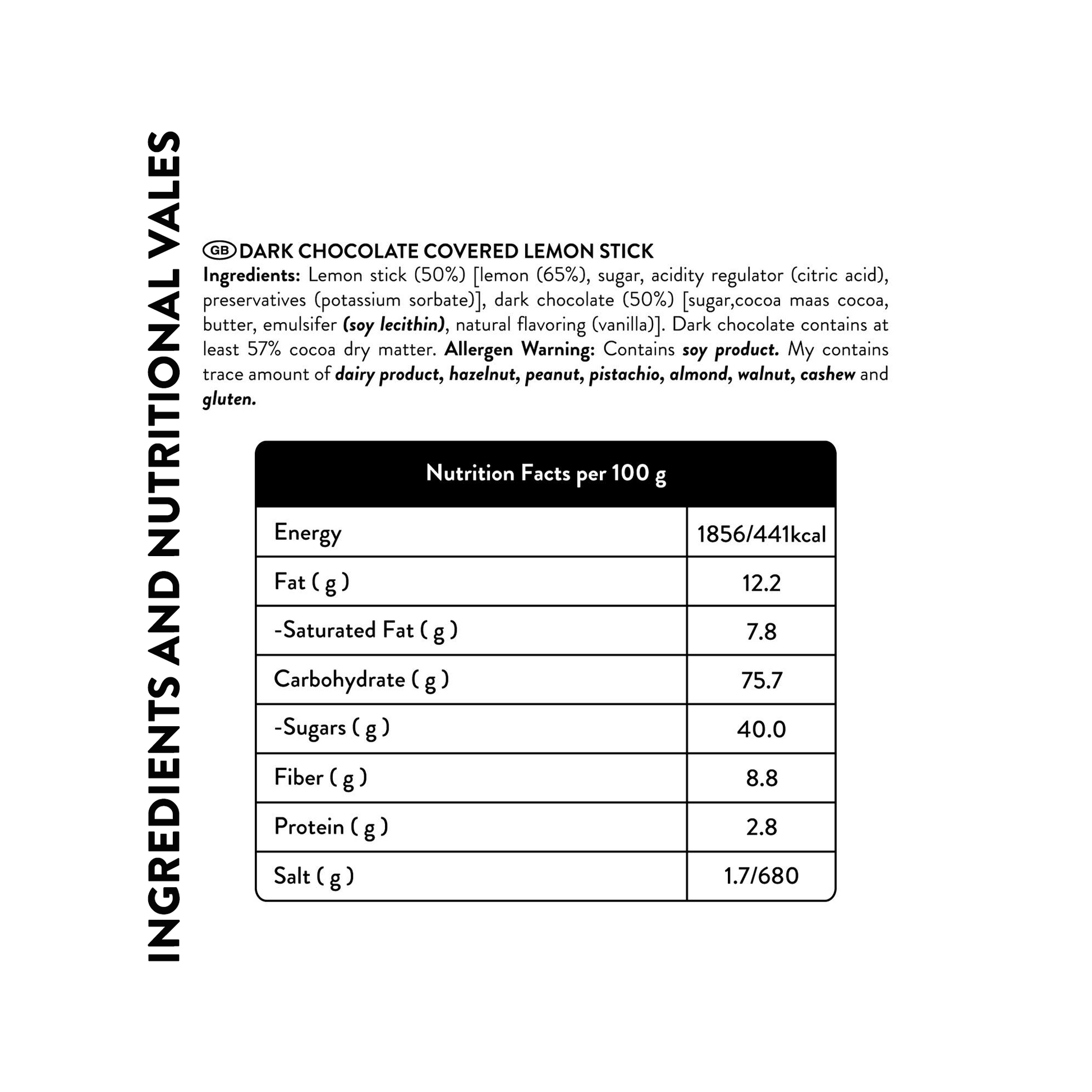 Der PatisLove Lemon Stick verleiht deinem Genussmoment eine spritzige, mediterrane Frische. Hergestellt aus sonnengereifter Zitronenschale und umhuellt von edler 57 % Zartbitterschokolade, vereint dieser Snack fruchtige Saeure mit tiefer Kakaointensitaet.