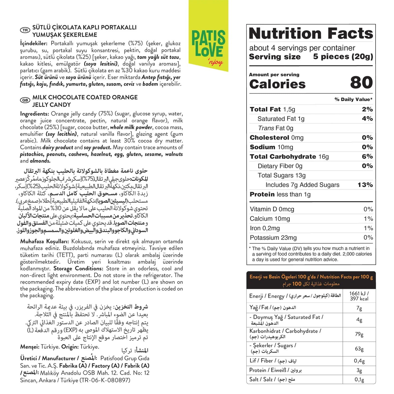 Erlebe den erfrischend-suessen Geschmack sonnengereifter Orangen, umhuellt von feinster Milchschokolade – mit den PatisLove Orange Gummies. Diese fruchtigen Snacks vereinen das saftige Aroma von Orangen mit dem cremigen Schmelz hochwertiger Schokolade und schaffen so einen einzigartigen Genussmoment.
